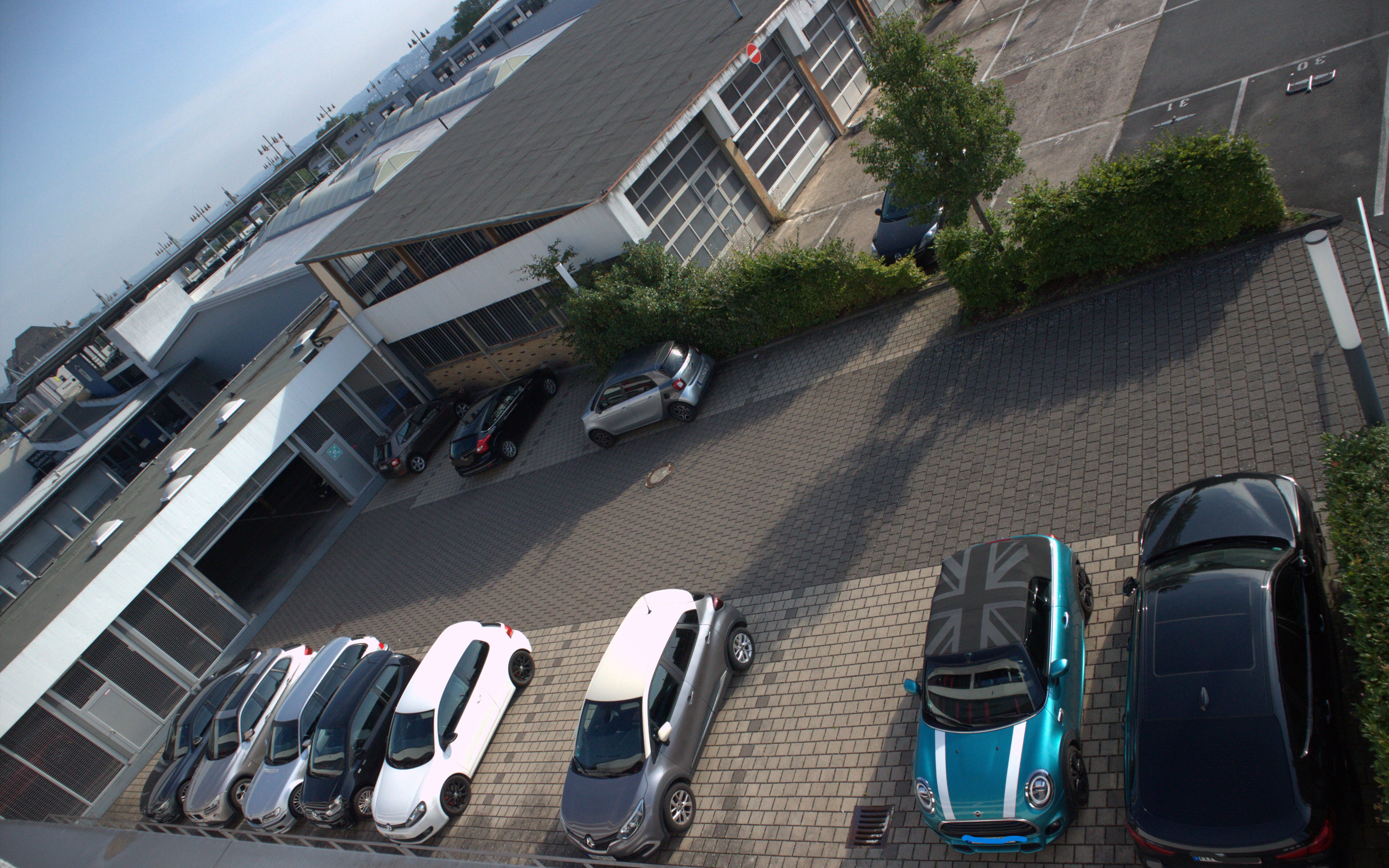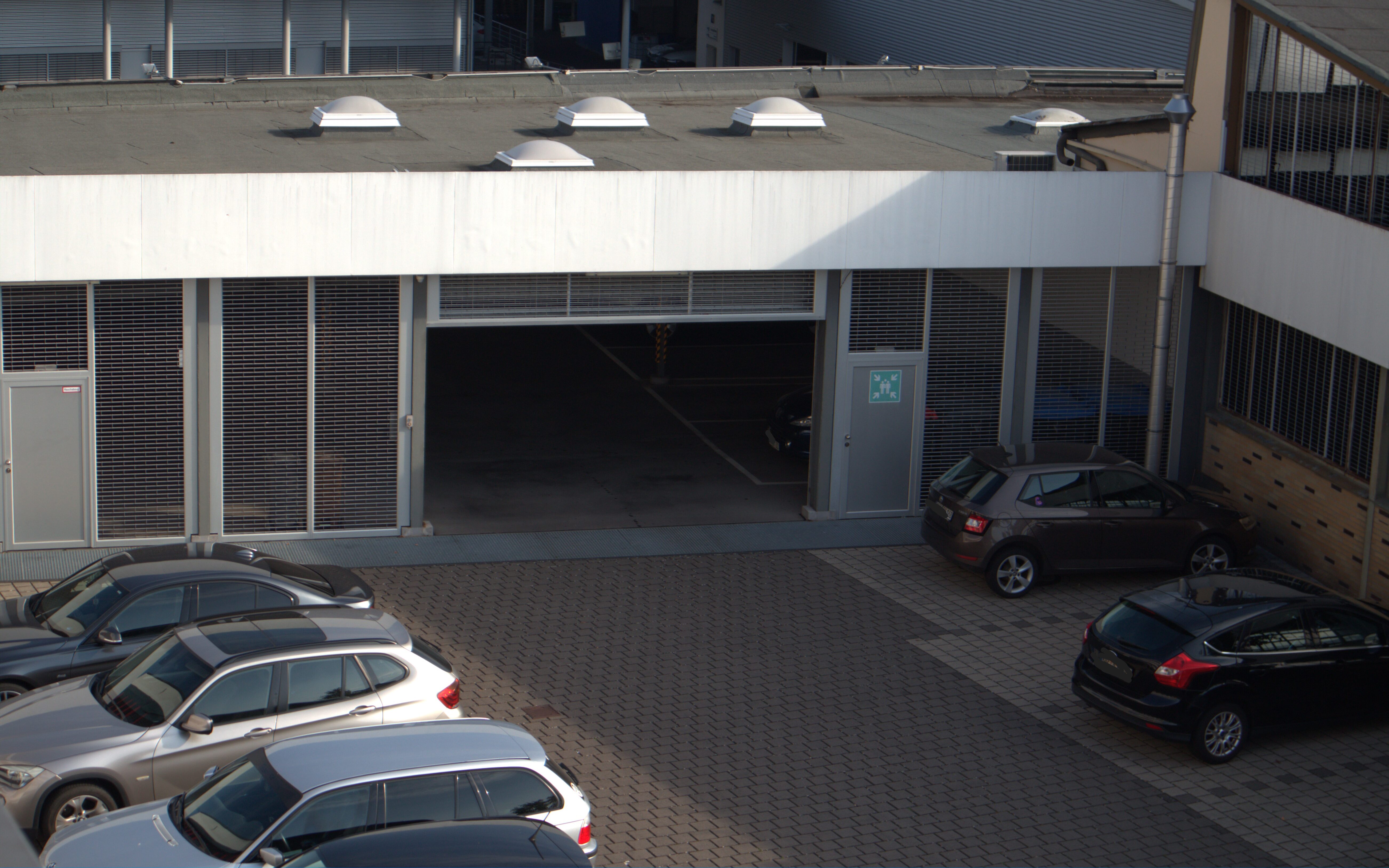 Die Freiflächen hinter dem Gebäude, von einer Schranke begrenzt, bieten Platz für 16 Fahrzeuge. Diese können für z.Zt. 75€ angemietet werden (parkplatz@fws-immo.com).